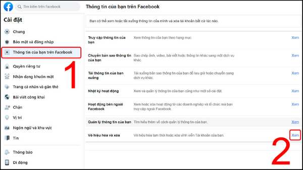 Bước 3: Trong menu bên trái, tìm và chọn Thông tin của bạn trên Facebook > Nhấn vào mục Vô hiệu hóa và xóa, sau đó chọn Xem.