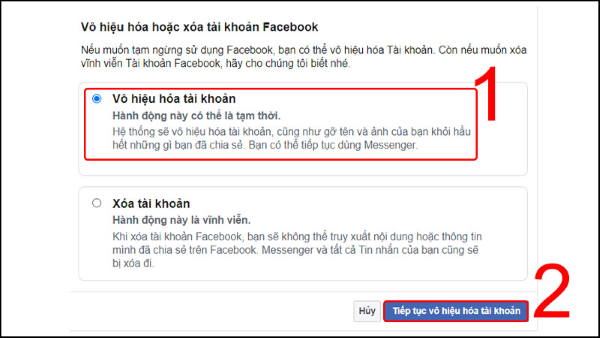 Bước 4: Chọn Vô hiệu hóa tài khoản, sau đó bấm Tiếp tục vô hiệu hóa tài khoản.