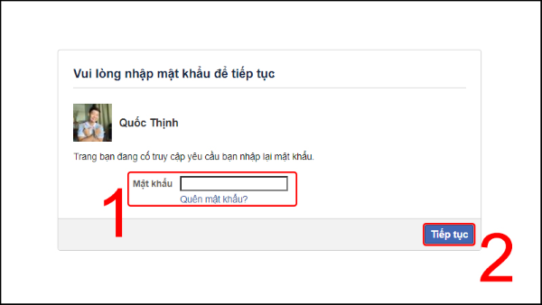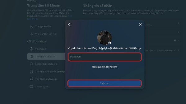 Bước 5: Nhập mật khẩu Facebook của bạn để xác nhận danh tính > Nhấn Tiếp tục.