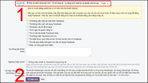 – Nếu chọn Đây là hành động tạm thời. Tôi sẽ quay lại, tài khoản sẽ tự động mở lại trong vòng 1-7 ngày hoặc khi bạn đăng nhập trước thời gian đã đặt.