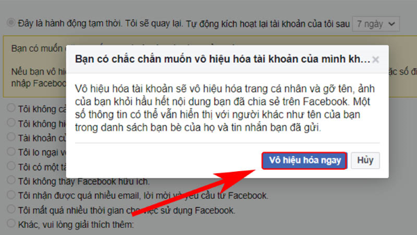 Bước 7: Một thông báo xác nhận sẽ xuất hiện trên màn hình, yêu cầu bạn xác minh việc vô hiệu hóa tài khoản. Nhấn Vô hiệu hóa ngay để hoàn tất quá trình.