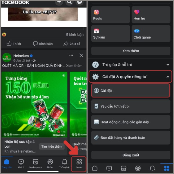 Bước 1: Truy cập ứng dụng Facebook trên iPhone của bạn > Nhấn vào Menu > Chọn Cài đặt & quyền riêng tư > Tiếp tục nhấn vào Cài đặt.
