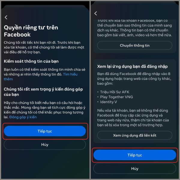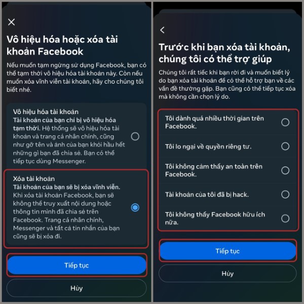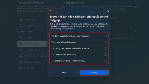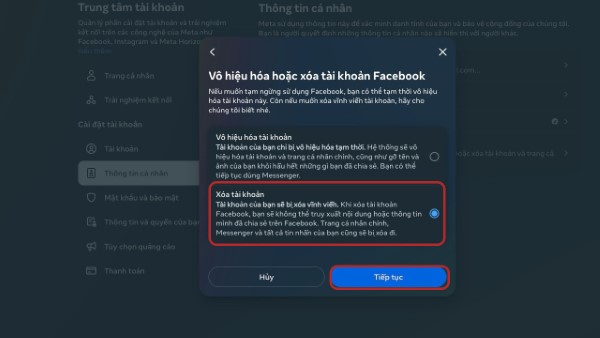 Bước 4: Chọn Xóa tài khoản, sau đó chọn lý do bạn muốn xóa tài khoản > Nhấn Tiếp tục.