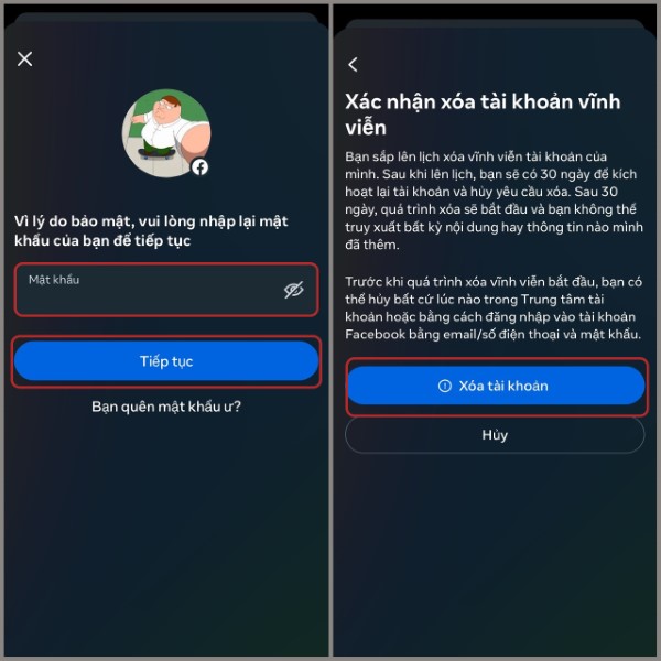 Bước 6: Nhập mật khẩu Facebook của bạn > Nhấn Xóa tài khoản để hoàn tất quá trình.