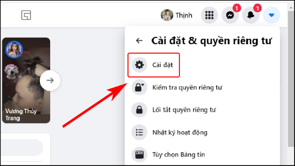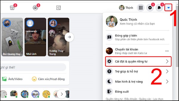 Bước 1: Tại giao diện chính của Facebook, nhấn vào biểu tượng tam giác ngược nằm ở góc trên bên phải màn hình > Chọn Cài đặt & quyền riêng tư.