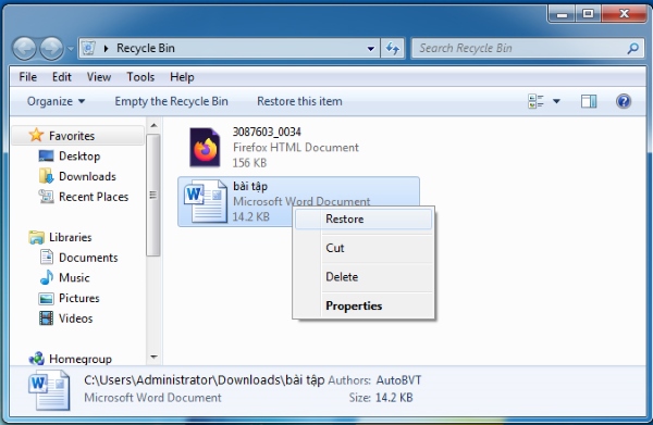 Vào thư mục Recycle Bin thùng rác trên thiết bị > Tìm đến hình ảnh, hoặc file cần thực hiện khôi phục lại và chọn nhấn chuột phải > Chọn vào tính năng Restore. Lúc này, hình ảnh hiển thị, hoặc file đã xóa sẽ được khôi phục lại tại vị trí lúc trước khi tiến hành thao tác xóa.
