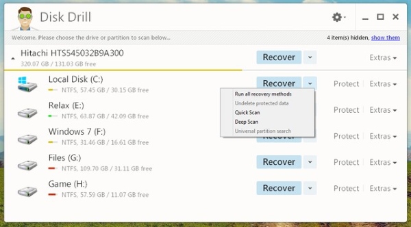 Đầu tiên chúng ta cần tải và cài đặt ứng dụng Disk Drill. Để khôi phục toàn bộ dữ liệu của một phân vùng bạn ấn vào nút Recover. Sau đó chọn vào tính năng quét để nhận dạng dữ liệu cần khôi phục.