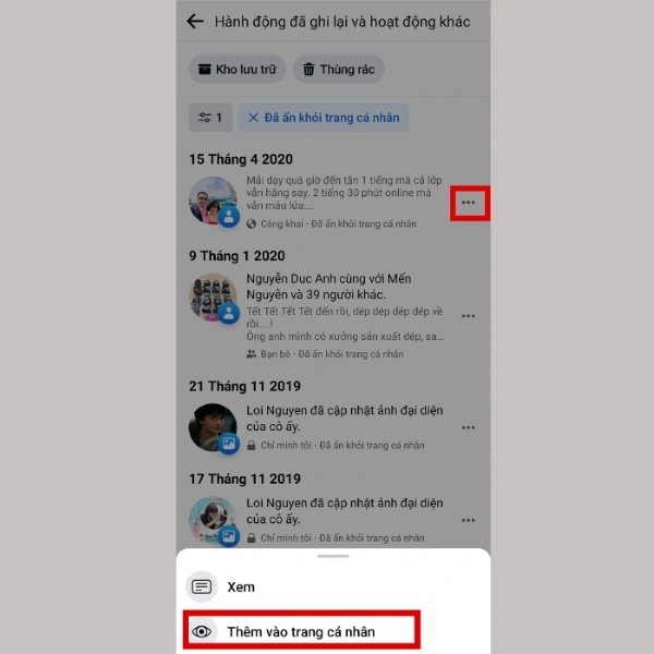 Bước 3: Để khôi phục một bài viết, nhấn vào biểu tượng ba chấm góc phải của bài viết đó và chọn “Thêm vào trang cá nhân”. Bài viết sẽ được khôi phục trên trang cá nhân của bạn.