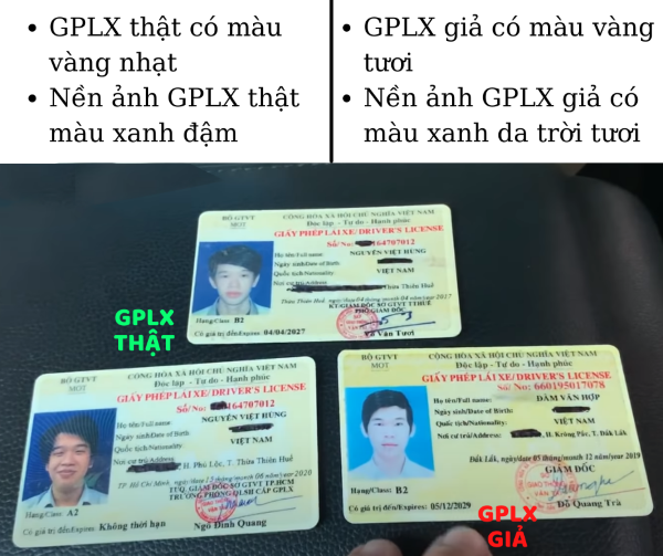 Trên thực tế hiện nay công nghệ làm bằng lái xe giả khá tinh vi, nhằm che mắt các cơ quan chức năng. Tuy nhiên do các yếu tố về công nghệ đặc biệt của việc in giấy phép lái xe, thì ngoài thao tác tra cứu hồ sơ gốc giấy phép lái xe, chúng ta có thể thực hiện phân biệt bằng mắt thường trên giấy phép bằng giả, có những chi tiết khác biệt như sau: