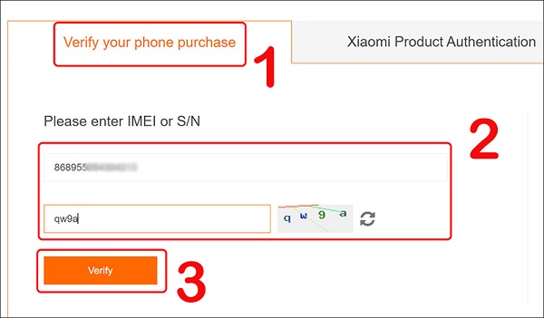 http://https//www.mi.com/global/verify/#/en/tab/imei >> chọn vào “Verify your phone purchase” >> nhập mã số IMEI và mã xác nhận >> chọn mục “Verify”. Sau đó hệ thống sẽ gửi kết quả về để bạn kiểm tra xem thiết bị của mình có phải hàng chính hãng hay không