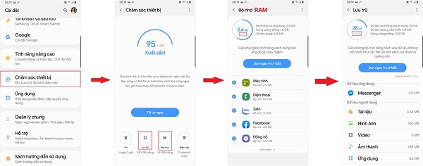 Bước 4: Đối với dòng điện thoại Android để xem dung được dung lượng RAM và dung lượng lưu trữ (ROM), người dùng hãy truy cập vào phần Cài đặt >> Chăm sóc thiết bị >> Lưu trữ hoặc Bộ nhớ. Lúc này sẽ thấy hiển thị lên dung lượng RAM và ROM trên điện thoại của mình.