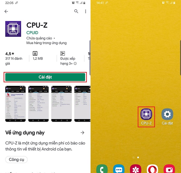 Bước 1: Đầu tiên người dùng cần tìm và tải ứng dụng CPU-Z về điện thoại sau đó nhấn chọn vào Cài đặt để tiến hành tải về.