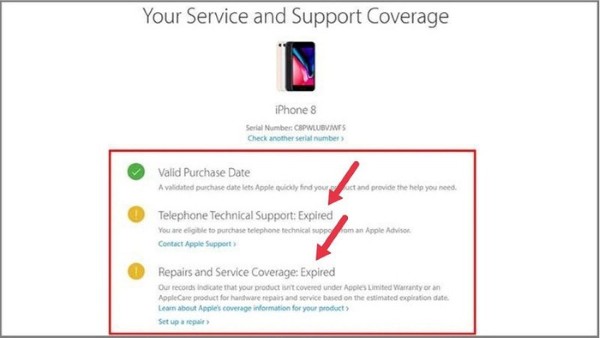 Bước 4: Với các thông tin được trả về, nếu tại mục Repairs and Service Coverage hiển thị Active (còn hỗ trợ bảo hành) hoặc Expired (hết hỗ trợ bảo hành) thì máy của bạn được xác định là phiên bản iPhone chuẩn Apple.