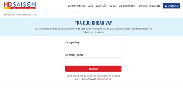 Bước 2: Trên thanh Menu của website bạn chọn mục “Tra cứu khoản vay” > nhập thông tin đúng theo yêu cầu của HD Saigon.