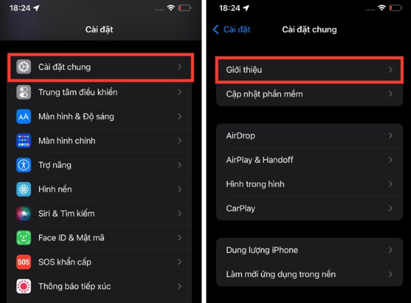 Bước 3: Sau khi iPhone của bạn hoàn tất việc cập nhật lên phiên bản hệ điều hành từ iOS 15.2 trở đi, tiếp tục truy cập vào phần Cài đặt. Tiến hành ấn chọn phần Cài đặt chung rồi chọn tiếp vào Giới thiệu.