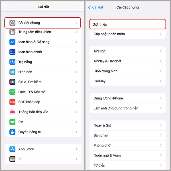 Đầu tiên, hãy truy cập vào mục Cài đặt trên điện thoại iPhone của bạn. Sau đó, bấm vào mục Cài đặt chung và chọn tiếp mục Giới thiệu.