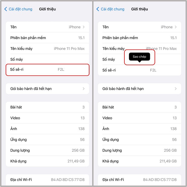Tại đây, bạn sẽ thấy các thông tin cơ bản về thiết bị và hãy thực hiện việc sao chép Số sê-ri iPhone của mình.