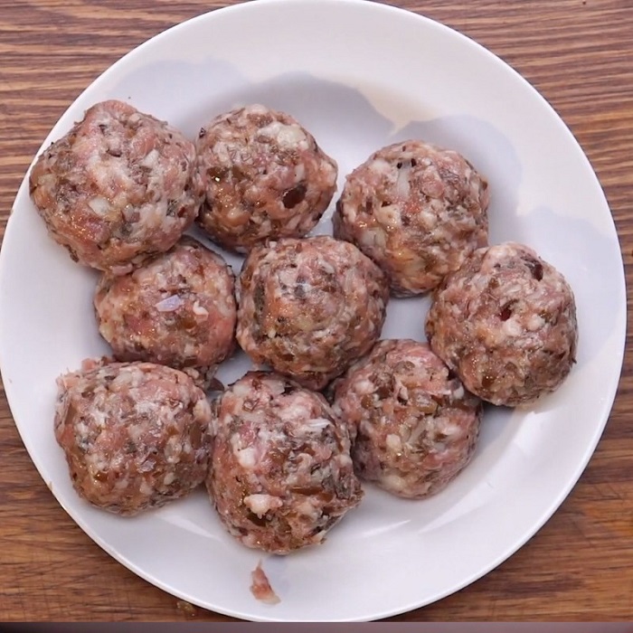 Sau khi đã sơ chế nguyên liệu xong bạn cho thịt lợn xay vào tô + mộc nhĩ + nước mắm + muối + hạt tiêu vào trộn đều. Cuối cùng đặt trứng cút vào giữa và nặn thành từng viên nhân tròn. Có thể dùng 1 hoặc 2 trứng cút tùy sở thích của bạn.