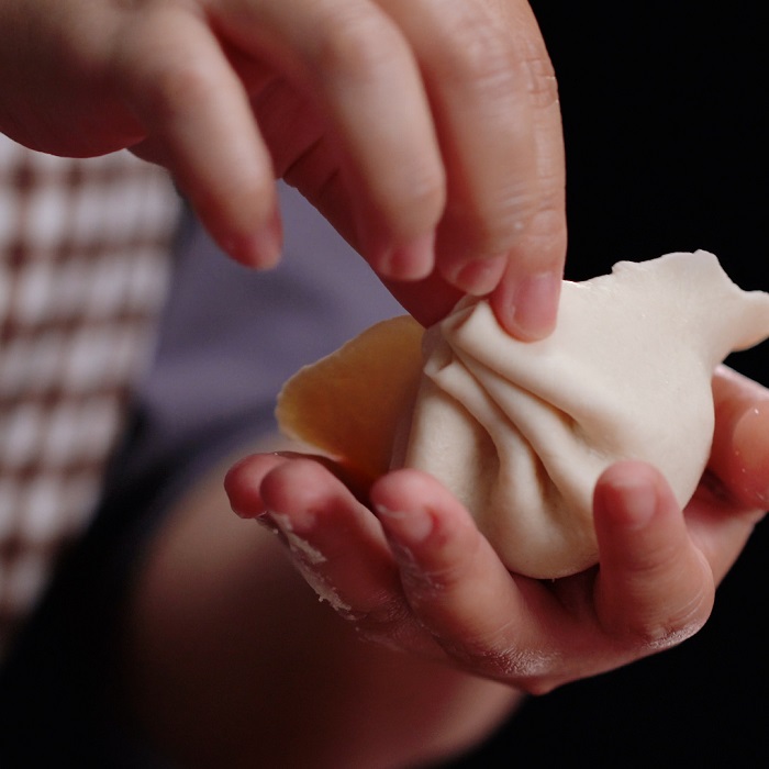 Tiếp tục dùng cán bột cán từng nắm bột đến độ mỏng như ý, quét thêm 1 lớp dầu ăn ở phần rìa ngoài rồi cho nhân vào giữa. Cuối cùng là mấp mép và túm gọn lại để tạo hình cho bánh bao.