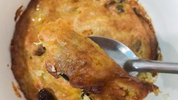 Thành phẩm ra lò là món bánh chuối có màu vàng ruộm vô cùng bắt mắt và thơm ngon. Bánh có độ dẻo, mềm và vị ngọt vừa phải, đi kèm phần topping chua nhẹ góp phần làm tăng thêm hương vị ngon cho bánh.