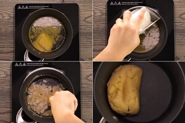 – Cho bơ vào nồi đun đến khi bơ tan. Tiếp đến cho đường, vani, muối hòa tan với phần bơ đã chảy. Sau đó bạn sử dụng rây để rây nhẹ phần bột mì vào hỗn hợp trên, trộn đều rồi tắt bếp.