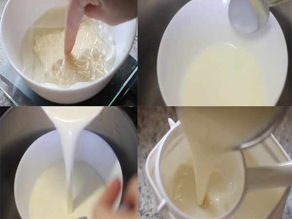 Tiếp theo, bạn đổ hỗn hợp trong bát vào khuôn qua rây cho mịn và cho vào ngăn mát tủ lạnh khoảng 3-4 giờ. Khi nào thạch đông lại hoàn toàn là bạn đã có phần kem sữa nguyên bản.