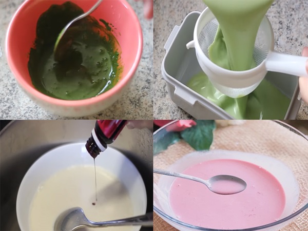 Với thạch kem sữa vị dâu, bạn cho một chút siro dâu hoặc vài giọt màu thực phẩm đỏ cùng với hương liệu dâu vào khuôn kem sữa, tiếp tục khuấy đều tay là sẽ có phần thạch dâu.