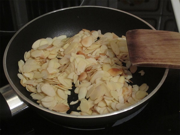 Cho hạnh nhân vào chảo đảo nhẹ tay và đều ở lửa vừa đến khi màu ngả sang hơi vàng một chút và tỏa mùi thơm. Sau đó cho hạnh nhân đã rang ra bát để nguội.