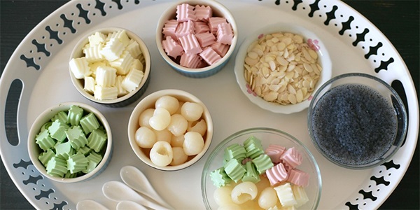 Sau khi thạch đông lại hoàn toàn, bạn gỡ thạch và cắt thành các miếng nhỏ vừa ăn, rồi cho thạch thạch vào ly, thêm hạt é, nước chè và rắc hạnh nhân lên trên. Như vậy là món chè khúc bạch của bạn đã hoàn thành rồi đó.