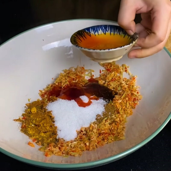 Phần tỏi, ớt, sả đã xay nhuyễn bạn cho vào 1 bát tô lớn. Sau đó cho thêm các gia vị đã chuẩn bị trước đó: tương ớt, dầu điều, đường 2 thìa canh, dầu hào, ngũ vị hương 1 thìa cà phê, bột nghệ, bột cà ri, bột canh, mì chính, gia vị bò khô rồi trộn đều lên.