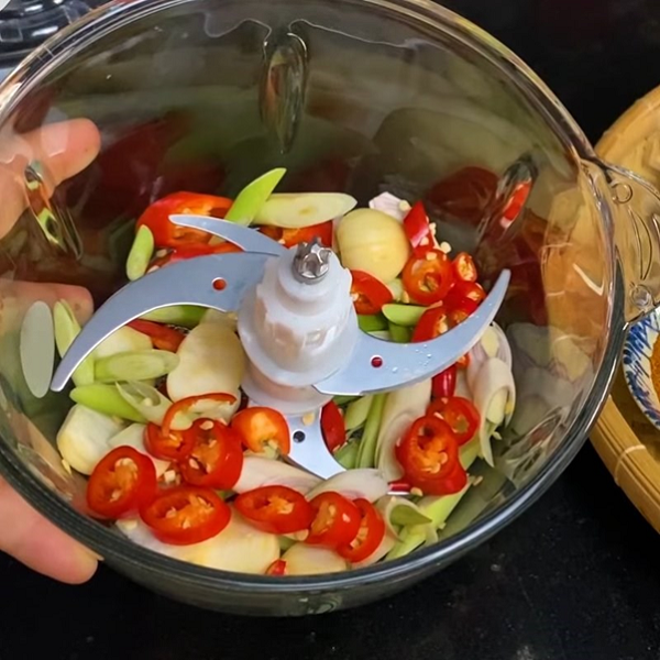Bước 2: Cho toàn bộ ớt, sả và tỏi vào máy xay tiến hành xay nhuyễn.