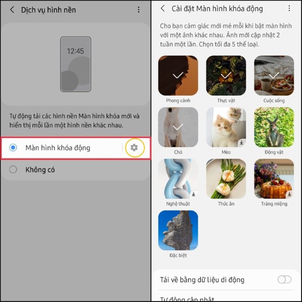 Bước 2: Chọn Màn hình khóa động, sau đó nhấn vào biểu tượng Cài đặt để tùy chỉnh các danh mục hình ảnh hiển thị.