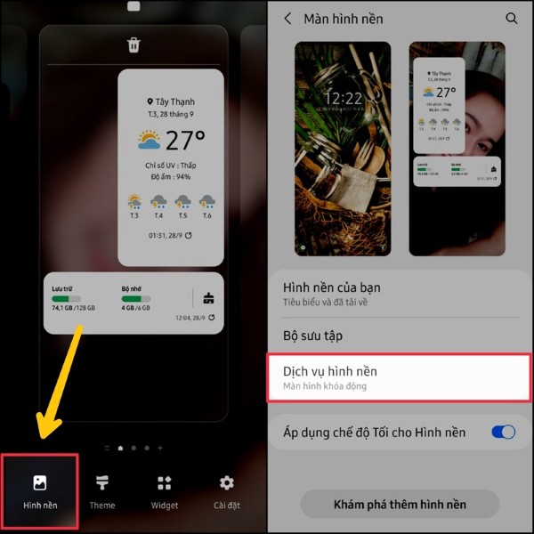 Bước 1: Nhấn giữ màn hình chính, sau đó chọn Hình nền > Chọn Dịch vụ hình nền.