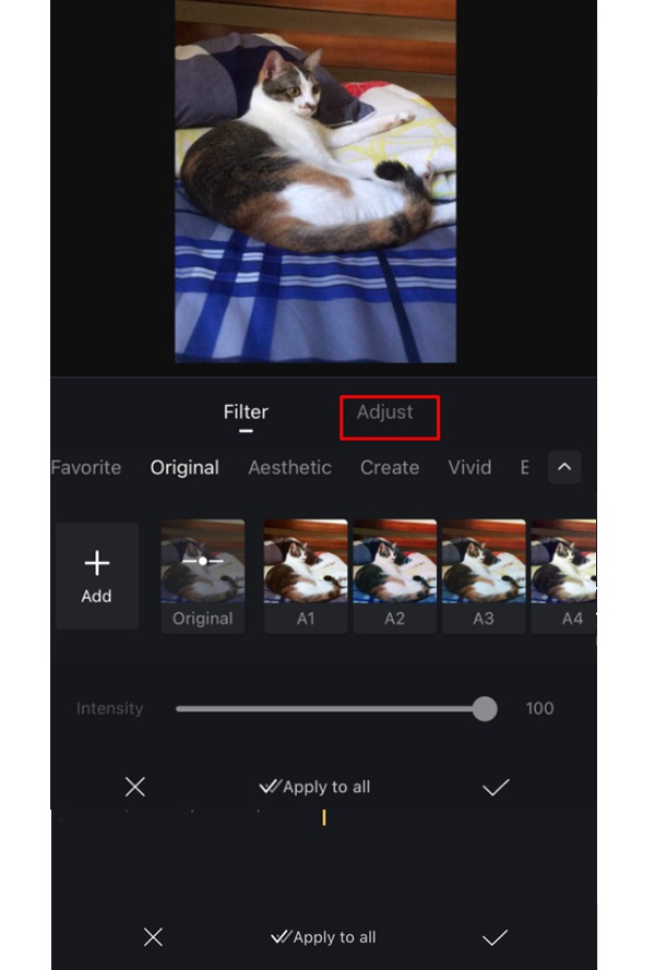 Bước 3: Chọn vào “Adjust” để tìm công cụ làm nét video -> chọn “Sharpness”để tiến hành làm nét video.