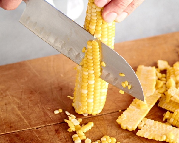 Bước 2: Ngô sau khi đã tách vỏ dùng dao tách hạt để riêng ra tô và giữ lại phần lõi.