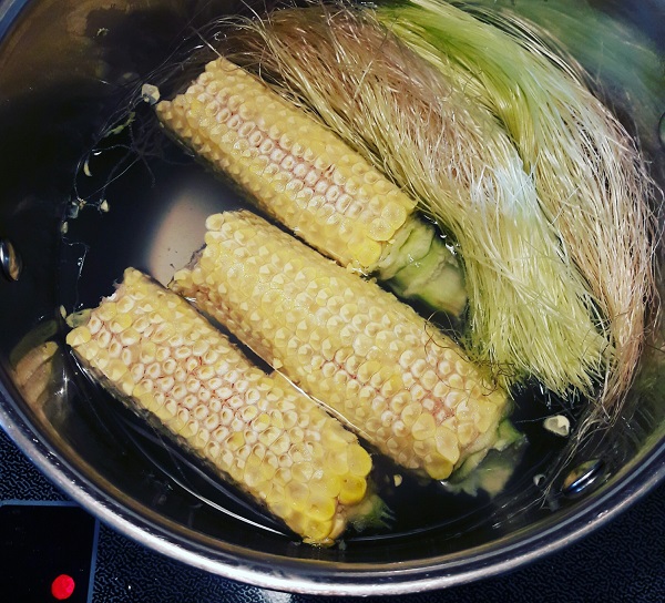 Bước 1: Cho phần áo ngô đã rửa sạch, lõi ngô và 500ml vào máy làm sữa hạt bật chế độ hầm trong 15 phút. Bạn có thể cho thêm lá dứa vào ở bước này. Phần nước này sẽ giúp sữa ngô thơm và ngọt hơn.