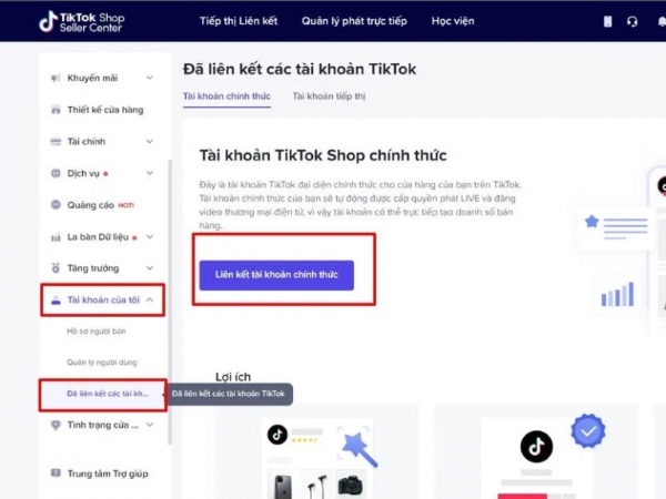Bước 3: Liên kết tài khoản TikTok cá nhân với tài khoản TikTok Shop bằng cách: Chọn vào Tài khoản của tôi/Đã liên kết các tài khoản TikTok/Liên kết tài khoản chính thức > nhập tên tài khoản trên TikTok.
