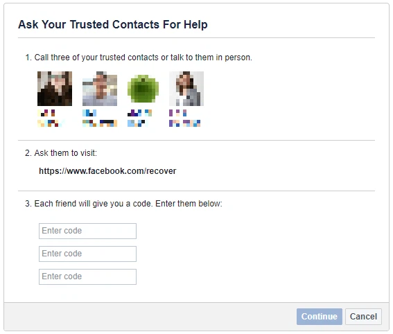 Để có thể lấy lại tài khoản Facebook, bạn phải nhận diện được ảnh đại diện cũng như tên tài khoản của tối thiểu ba người đã chọn. Tiếp theo, gửi yêu cầu những người này truy cập vào trang khôi phục tài khoản, lấy mã xác nhận rồi gửi lại cho bạn. Sau đó, bạn hãy nhập lại mã này là xong.