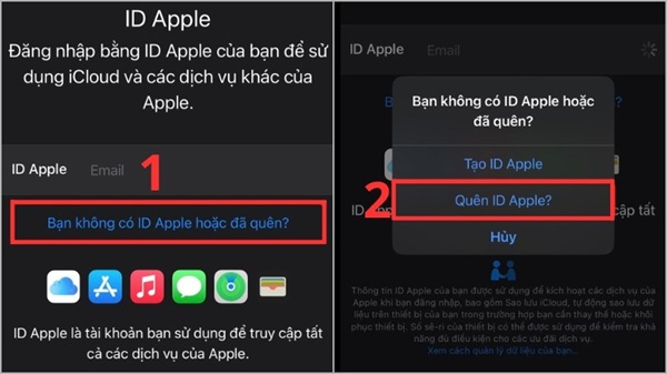 Tiếp theo, bạn bấm vào mục “Bạn không có ID Apple hoặc đã quên?” và nhấn chọn tiếp vào mục “Quên ID Apple?”.