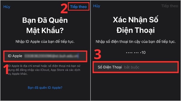 Ở bước này, bạn hãy nhập ID Apple muốn khôi phục vào bấm chọn Tiếp theo > Tiếp tục nhập Số điện thoại đã đăng ký tài khoản iCloud trên.