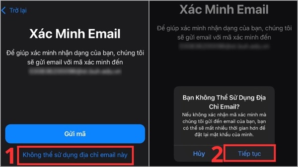 Lúc này, bạn sẽ nhận được yêu cầu xác minh Email từ Apple. Hãy nhấn vào mục Không thể sử dụng địa chỉ email này > Chọn Tiếp tục.