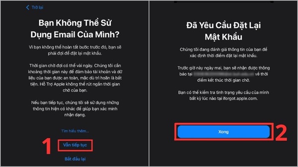 Cuối cùng, bạn chọn Vẫn tiếp tục và bấm vào nút Xong rồi chờ một vài giây để thiết bị khôi phục lại mật khẩu iCloud của bạn.