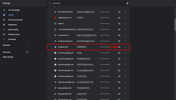 Bước 3: Trên màn hình lúc này, bạn sẽ nhìn thấy tất cả các mật khẩu cùng trang web mà mình đã lưu. Bạn chỉ cần tìm đến Facebook > nhấn vào biểu tượng con mắt bên cạnh để mật khẩu hiện lên và đăng nhập Facebook như bình thường là được nhé!