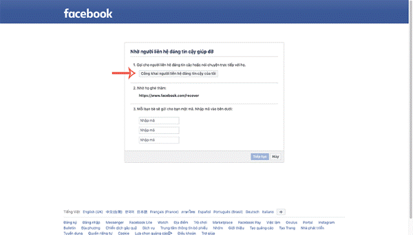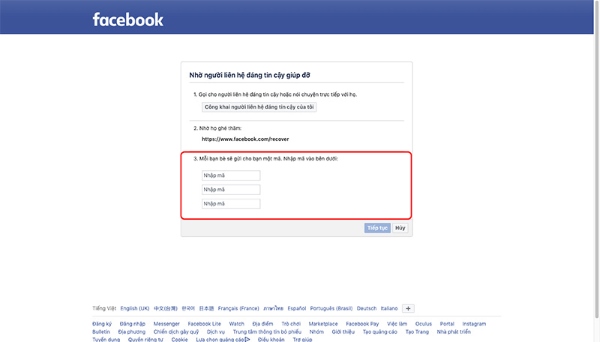 Lúc này, bạn bè bạn sẽ nhận được mã code mà Facebook cung cấp. Bạn chỉ cần nhập những mã xác nhận này vào cửa sổ của Facebook > nhấn Tiếp tục là xong.