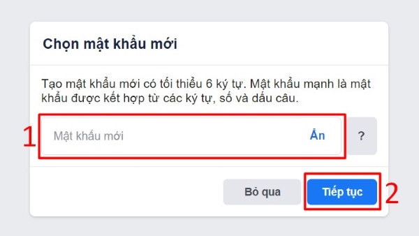 Bước 4: Nhập mật khẩu mới cho Facebook của mình, sau đó chọn Tiếp tục.