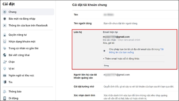 Bước 1: Mở thiết bị vẫn đang đăng nhập Facebook và thao tác lần lượt: Nhấn vào More (mũi tên xuống) ở góc trên bên phải > chọn Cài đặt và cài đặt riêng tư (Settings and Privacy) > chọn Cài đặt (Settings) > chọn Chung (General) > chọn Liên hệ (Contact).