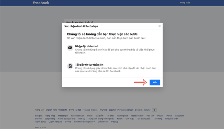 Bước 2: Trên cửa sổ mới, bạn nhấn Tiếp > nhập địa chỉ email mới để phía Facebook có thể liên lạc với bạn > nhập mã xác minh gửi tới trong email.