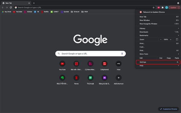Bước 1: Khởi chạy trình duyệt Google Chrome > nhấn vào biểu tượng dấu 3 chấm ở góc trên màn hình > chọn Cài đặt.
