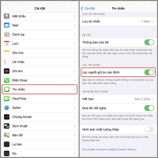 Bước 1: Bạn truy cập vào mục Cài đặt trên điện thoại iPhone và bấm vào mục Tin nhắn > Sau đó gạt công tắc sang phải để kích hoạt tính năng Lọc người gửi không xác định.