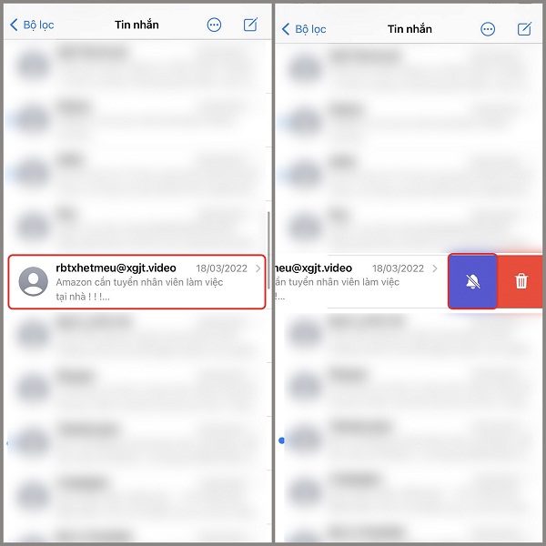 Để không bị làm phiền bởi thông báo tin nhắn từ người lạ, bạn có thể tắt chúng đi bằng cách truy cập vào ứng dụng Tin nhắn, bấm vào tin nhắn muốn chặn đồng thời kéo sang trái. Sau đó, bạn nhấn chọn vào biểu tượng Tắt tiếng là xong.